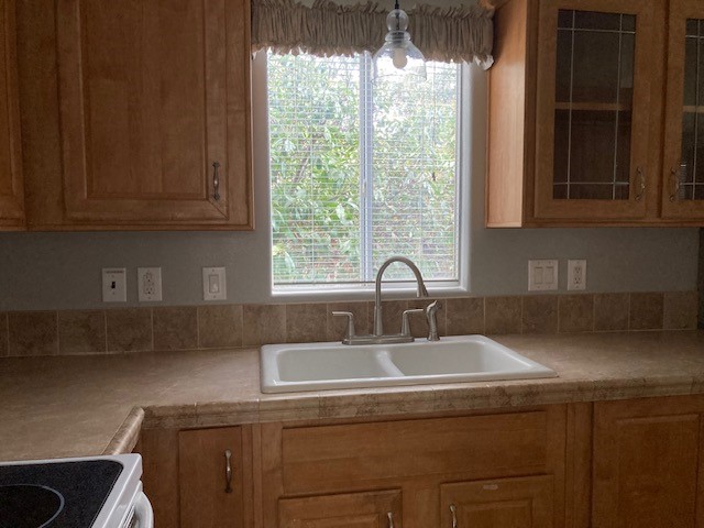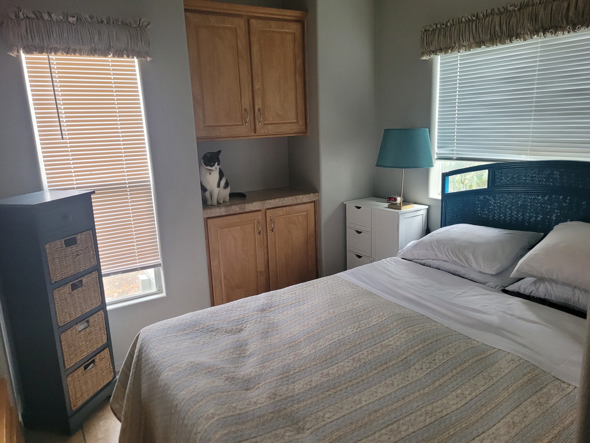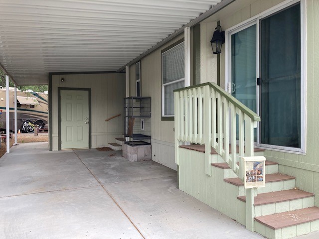 $650 per month lot fee. Much less if paid annually. Includes use of all amenities as well as water, sewer, and trash. *11′ x 31′ (341 square feet) *White GE kitchen appliances *Disposal in dual sink w/ sprayer *White full-sized washer and dryer in large attached storage shed (not all units have w/d space allowed) *Maple kitchen/bath cabinets *Walk-in shower with glass doors *Tile floors throughout *2 ceiling fans with lighting *Large mirrored-door closet in bedroom with extra storage. *Privacy screens on windows as well as curtains on sliding glass door that leads to 2nd set of stairs. *Covered carport parking*Small backyard area with large shade tree with room for patio furniture *Sold unfurnished *Attached outdoor catio with pet door access in bath (This can be easily removed and covered or a ramp attached to accommodate small dogs) BUYER TO VERIFY. NO WARRANTIES STATED NOR IMPLIED. MUST BE APPROVED TO LIVE IN PARK PRIOR TO PURCHASE.